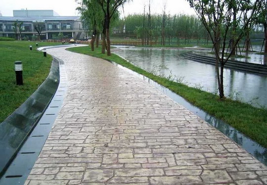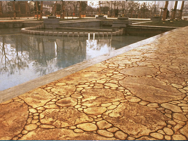 壓模工藝用于新澆筑的混凝土表面,能成型色彩艷麗并具有裝飾紋理的飾面。同時還具備單一混凝土所沒有的防腐、防滑、耐磨等特質(zhì),其效果遠超過花崗巖、大理石、青石板、木板及磚石等,可用于行車道、人行道、庭院和游泳池旁。