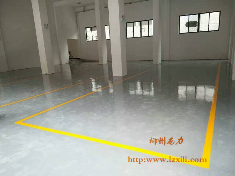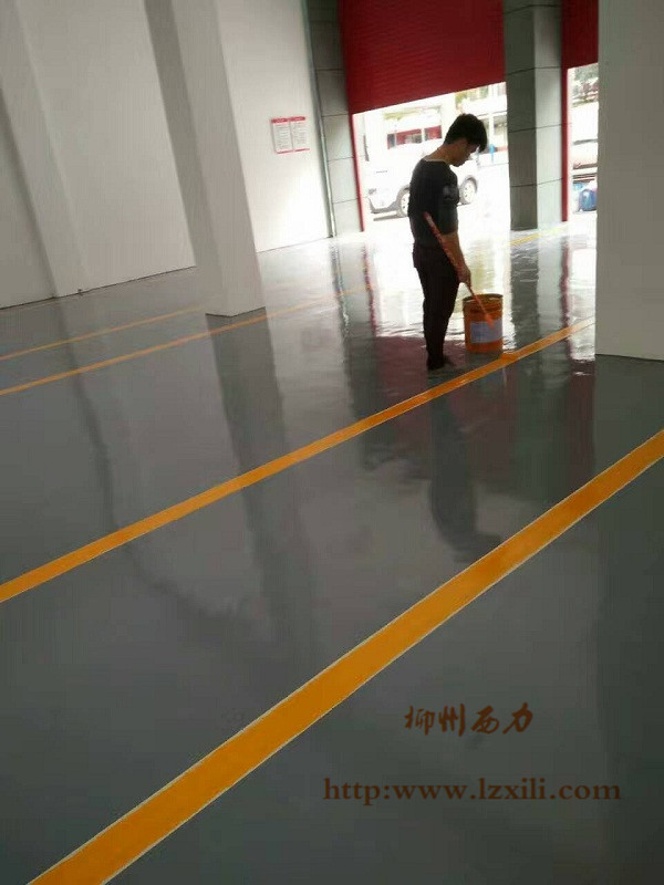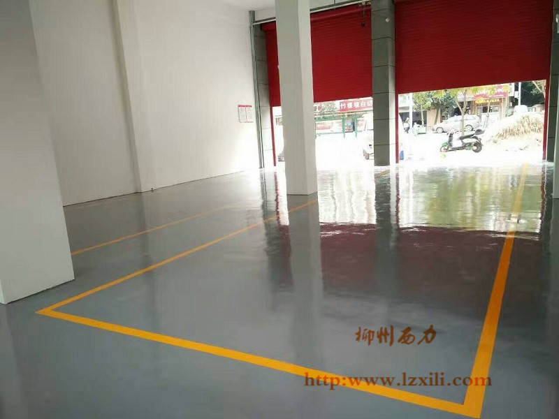圖為柳州白沙消防隊新做的環(huán)氧地坪,灰色面漆+黃色劃線漆,非常明顯的標(biāo)志,整個場地看起來也亮如鏡子。
